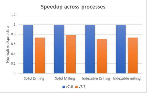 AdvantEdge v7.7では、計算速度が約25%向上します。このデータは、異なる材料と加工条件を用いたフライス加工と穴あけ加工を組み合わせた48の事例に基づいています。