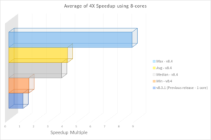 処理速度の向上率は、計算に使用するコア数によっても異なります。プロダクションモジュールは、利用可能な場合は最大8つの計算コアを自動的に使用します。プロダクションモジュールは、コンピュータ上の他のプロセス用に常に2つのコアを残しておきます。たとえば、ユーザーが6コアCPUを使用している場合、プロダクションモジュールは自動的に4コア(6コア-2コア)を計算に使用します。4コア使用時の平均処理速度向上率は、前リリースの2.9倍です。